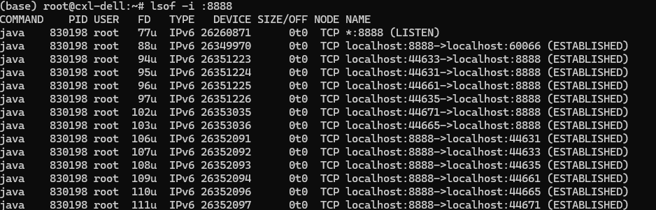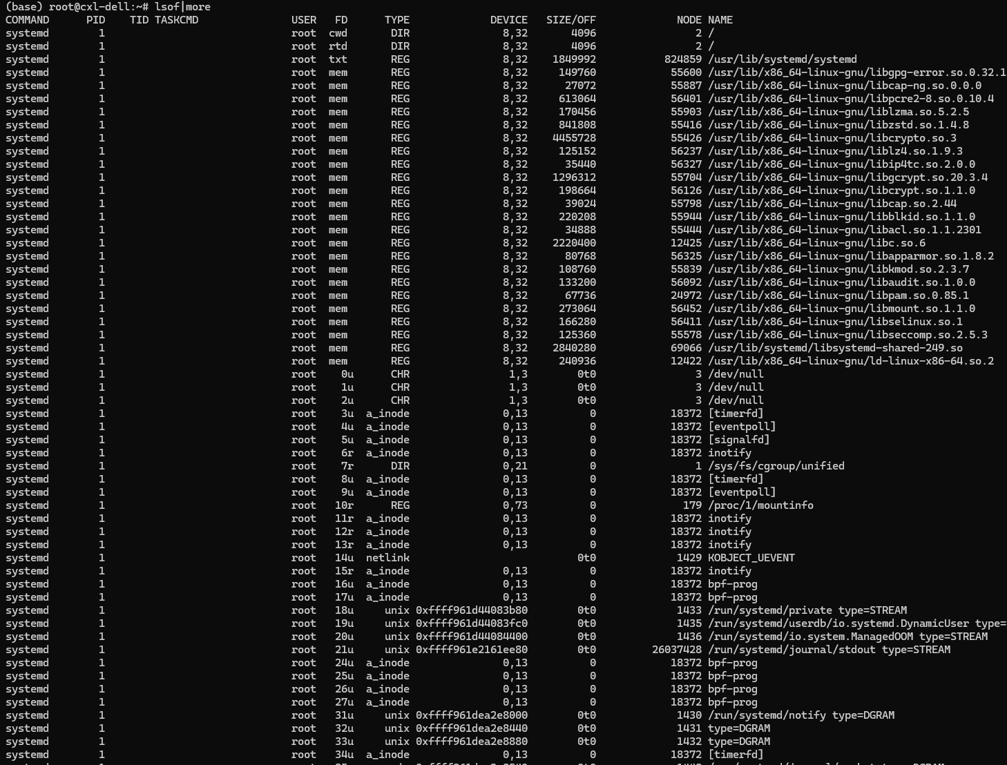 ,这将列出系统中所有进程打开的所有文件资源,但此举输出信息量巨大,要仔细甄别,我一打印这个命令屏幕直接就是刷刷刷,按ctrl+c都拦不住啊,于是就加了个 | more
