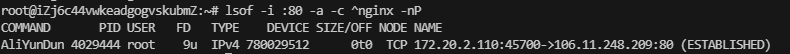 sudo lsof -i :80 -a -c ^nginx -nP # 这里^nginx表示排除进程名包含nginx的进程