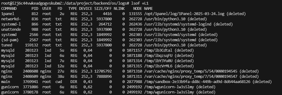 这种情况通常是由于文件被进程打开后又被删除,导致空间未被释放。lsof可以查找这类"已删除但未释放"的文件
