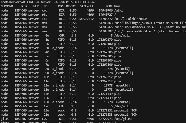 sudo lsof -u server -a -sTCP:ESTABLISHED -nP