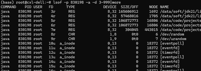 sudo lsof -p 830198 -a -d 3-999 # 排除stdin/out/err后查看自定义FD
