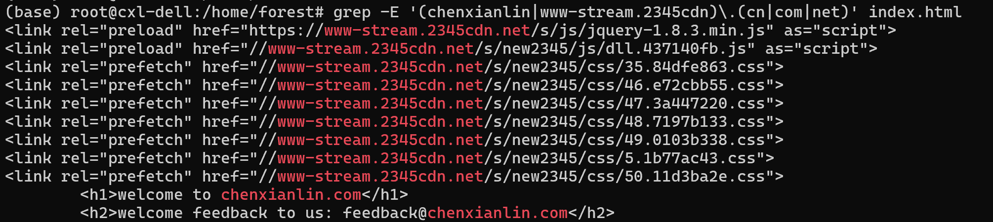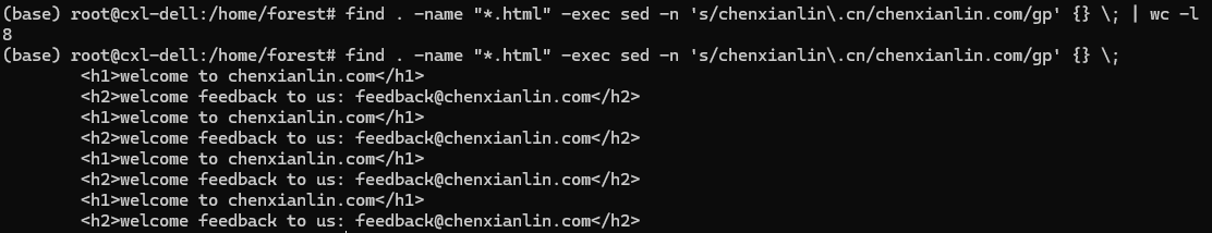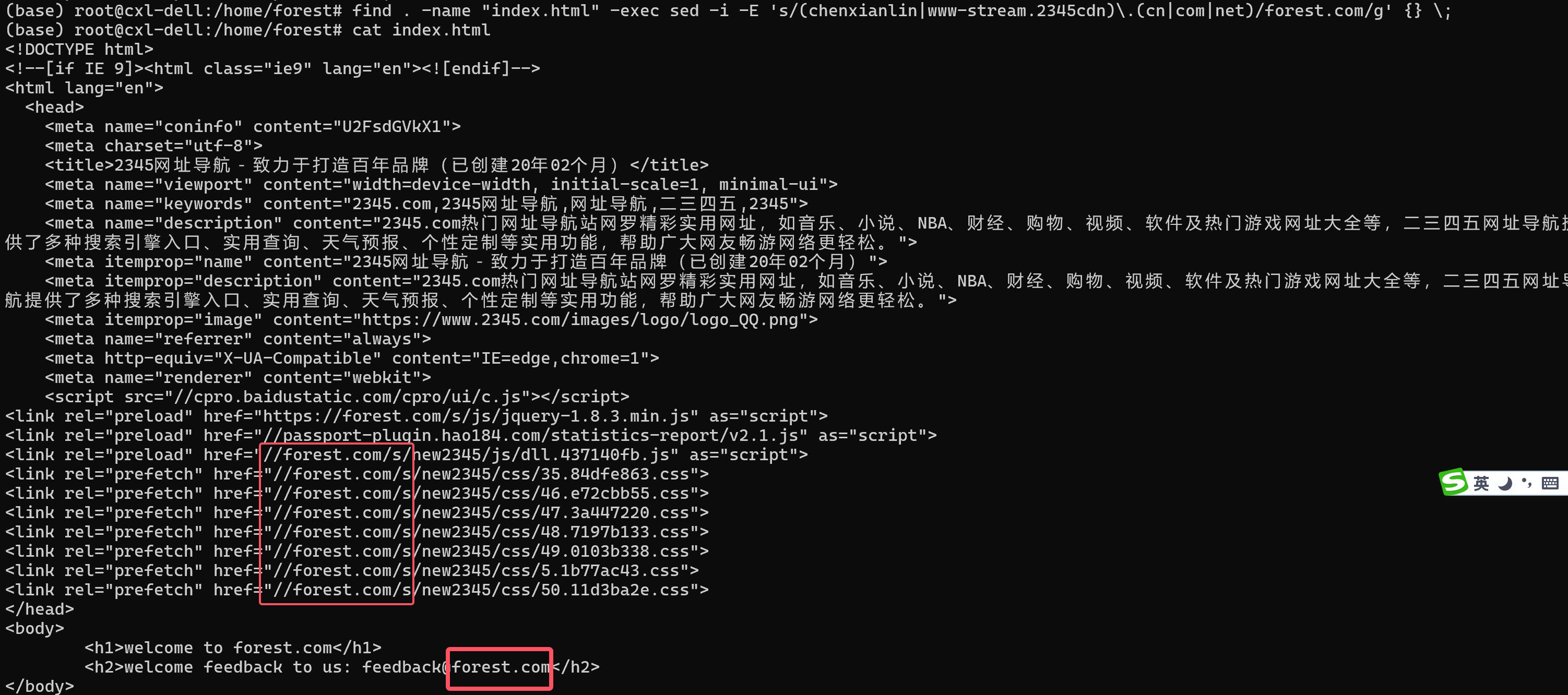 先用grep看下执行之前的数据,再执行替换,我这里只替换当前目录的index.html文件 find . -name "index.html" -exec sed -i -E 's/(chenxianlin|www-stream.2345cdn)\.(cn|com|net)/forest.com/g' {} \;