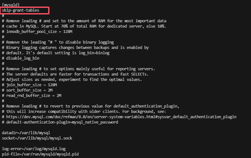 mysql一般配置文件位于 /etc/my.cnf 编辑此文件在[mysqld]下一行新增 skip-grant-tables 意思是登录时跳过密码验证